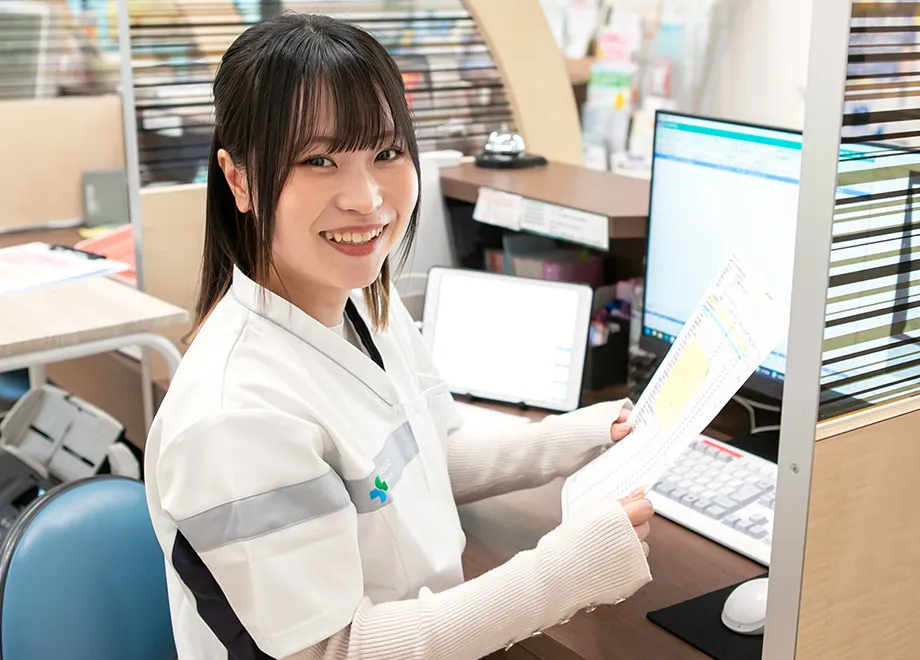 医療事務として、患者さまの受付から調剤補助、会計、レセプト業務といった日々の業務を正確にこなすことはもちろん、患者さまが安心して相談できる温かい雰囲気作りも大切な役割です。患者さまとの交流を通じて、患者さまが笑顔で帰っていく。これが、一番の魅力・やりがいです。
