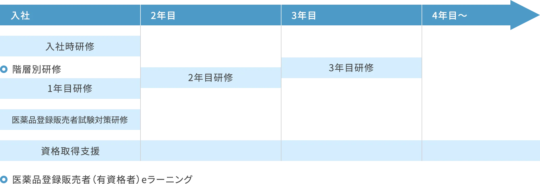 | 医薬品登録販売者資格 | 法人価格での教材斡旋と、社内の試験対策動画配信でサポートしています。 新卒入社1年目社員には試験対策教材の支給をしています。 |